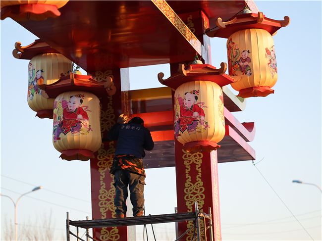 2月11日,杨柳青古镇,工人正在悬挂年画主题的春节花灯。