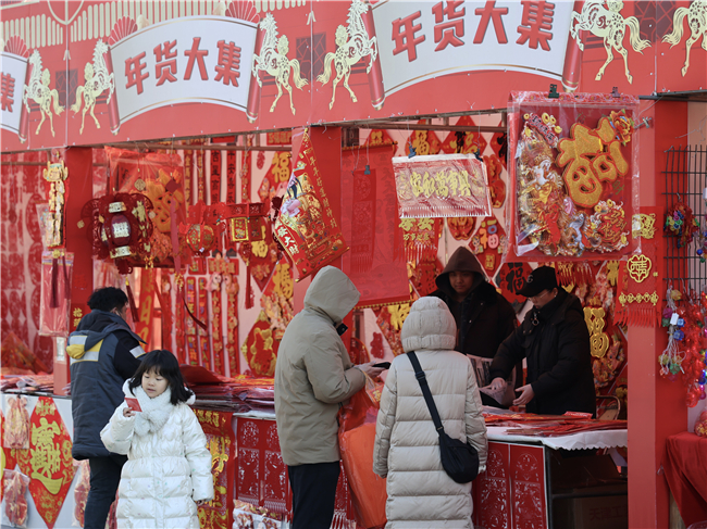 人们在杨柳青古镇年货大集上选购年画、对联、福字。