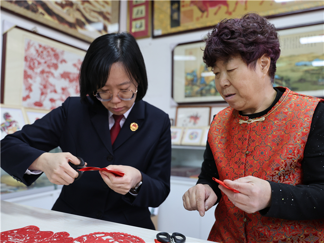 春节前,西青区检察院检察官走访天津市级非物质文化遗产杨柳青剪纸代表性传承人郝桂芬。