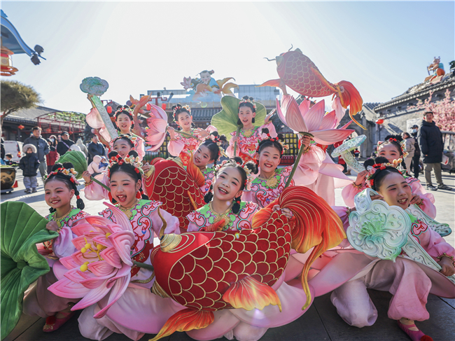春节前,天津市某国际舞蹈学校的小朋友们在杨柳青古镇广场上,以年画娃娃为造型表演民俗舞蹈。