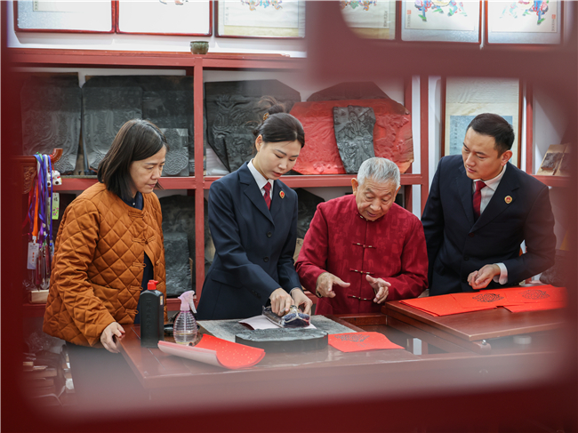 春节前,天津市西青区检察院检察官回访国家级非物质文化遗产代表性项目杨柳青木版年画传承人霍庆顺。