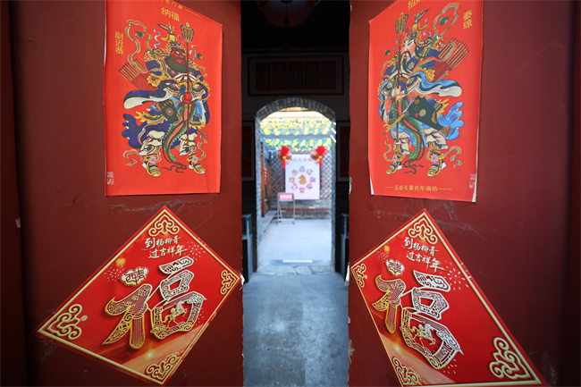 春节前,杨柳青古镇里,家家户户的大门上都贴着年画和福字。